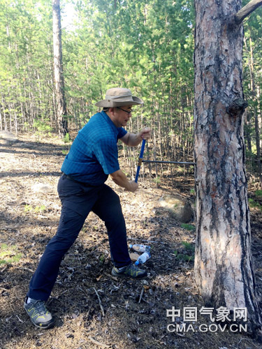 我国科研人员在哈萨克斯坦进行树轮采样。张同文 摄影